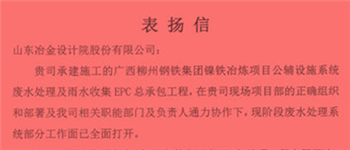近日,公司總承包的廣西柳州鋼鐵集團(tuán)鎳鐵冶煉項(xiàng)目公輔設(shè)施系統(tǒng)廢水處理及雨水收集工程項(xiàng)目部收到業(yè)主表?yè)P(yáng)信,稱贊項(xiàng)目部在安全、...