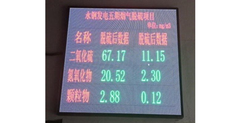 公司EPC總承包的聯(lián)峰鋼鐵有限公司電力廠5#煙氣脫硫項(xiàng)目自投運(yùn)以來,通過對鍋爐煙氣脫硫前后參數(shù)的采集與對比,對脫硫劑小蘇打的噴吹量實(shí)現(xiàn)自動(dòng)調(diào)節(jié),經(jīng)過一個(gè)月的調(diào)試,除塵器出口煙氣含塵顆粒物、SO2,氮氧化物的含量均低于國家超低排放行業(yè)標(biāo)準(zhǔn),達(dá)到公司承諾運(yùn)行保證值,滿足性能考核要求。脫硫后的排放數(shù)據(jù)實(shí)時(shí)顯示到大屏,對外公布。