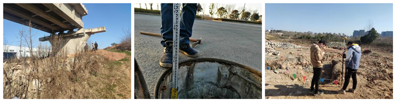 本次現(xiàn)場實測數(shù)據(jù)包含現(xiàn)狀鐵路橋橋墩坐標、橋梁凈空,已建設(shè)道路交叉口坐標及高程,已施工雨、污水井坐標及井深等,測量項目涉及到“陽邏之心”50多萬平方米二十余條道路,測量范圍廣闊,測量目標眾多,而測量人員僅為王學皓、吳修業(yè)及二十冶測量技術(shù)員陳工,實測任務(wù)異常艱巨。現(xiàn)場多為半施工或未施工道路,測量情況十分復雜,并同時遭遇武漢強降溫天氣,踏勘工作面臨極大考驗。尤其在雨污水井數(shù)據(jù)測量方面,部分道路車流量較大,需搭設(shè)臨時圍擋保證測量安全;部分重型井蓋受重載車輛碾壓密實變形,現(xiàn)有工具簡陋,僅打開井蓋這一項往往需要數(shù)十分鐘,完成單個井數(shù)據(jù)測量至少需要一個多小時,遠遠超出預估時間。與時間節(jié)點競速,測量人員踏霜踩露而出,披星戴月而歸,歷經(jīng)四天全力以赴、克難攻堅,圓滿完成所有測量任務(wù),為設(shè)計工作順利進行提供了有力的數(shù)據(jù)支持。