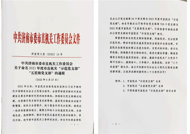 市委市直機關(guān)工委印發(fā)的《關(guān)于命名2021年度市直機關(guān)“示范黨支部”、“五星級黨支部”的通報》(濟直黨工發(fā)〔20221號文)中,授予我單位熱風(fēng)爐工程技術(shù)分公司黨支部、焦化事業(yè)部黨支部、耀華能源公司黨支部、土建設(shè)計一部黨支部、土建設(shè)計二部黨支部、職能管理第一黨支部、公司辦公室黨支部、電氣設(shè)計部黨支部、經(jīng)營管理黨支部、職能管理第二黨支部共10個黨支部為“五星級黨支部”。獲獎支部將繼續(xù)發(fā)揮示范作用,團結(jié)激勵支部黨員,不忘初心、勇于擔(dān)當(dāng),努力為公司發(fā)展做出更大貢獻。